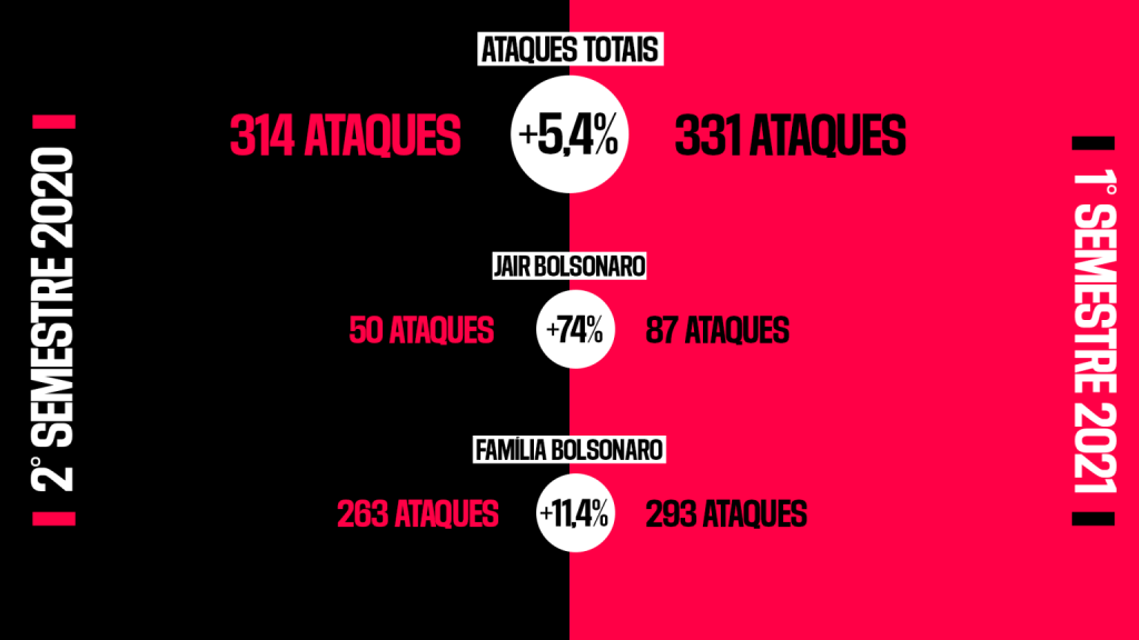 Segundo dados da Repórter Sem Fronteiras, no primeiro semestre de 2021, o número de ataques do chefe de Estado brasileiro contra a imprensa aumentou 74% em relação ao segundo semestre de 2020. Ao todo, Jair Bolsonaro realizou 87 ataques contra jornalistas, número que o torna o principal agressor naquele período.