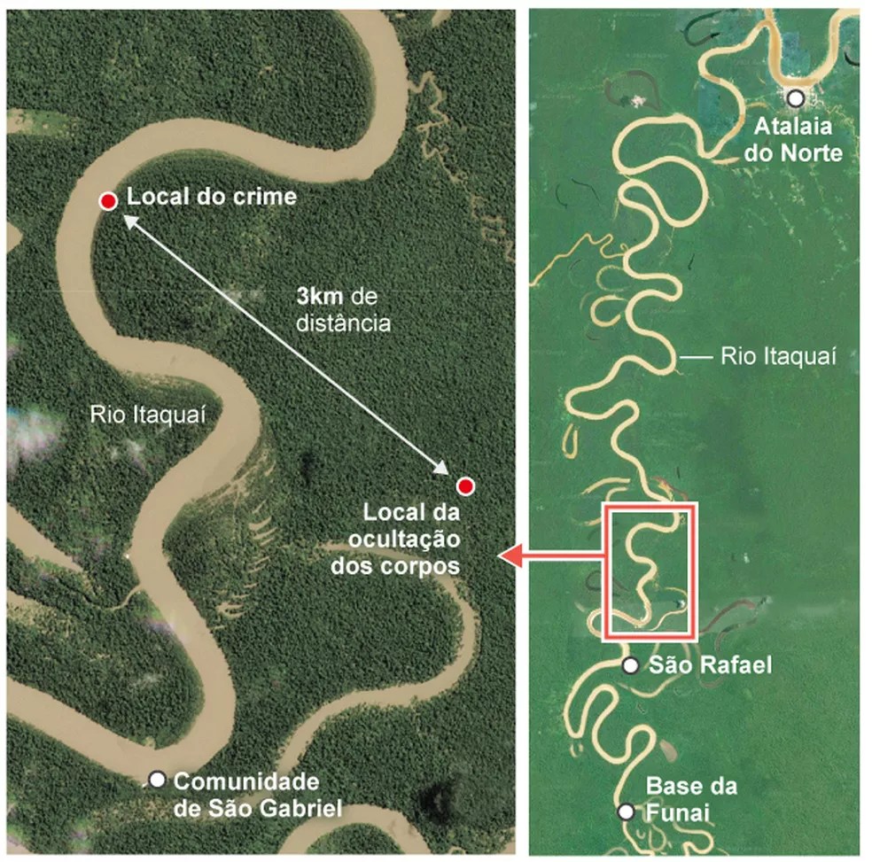 Os corpos de Dom e Bruno foram então queimados e, posteriormente, esquartejados e enterrados em uma vala, em uma área de difícil acesso. Além de Amarildo e Jefferson, Osaney da Costa Oliveira, conhecido como “dos Santos”, que é irmão de Pelado, também foi preso, mas não confessou participação no crime. Todos os envolvidos são pescadores da região e podem estar ligados à pesca ilegal de pirarucu, espécie típica da Amazônia.